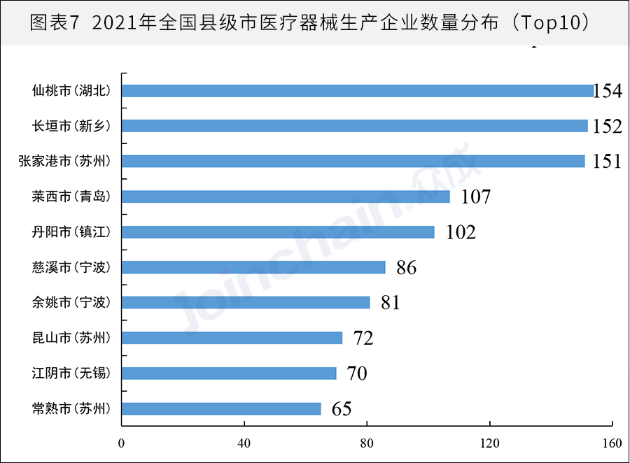 从县级市排名看,湖北仙桃市医疗器械生产企业154家,位居全国第一;新乡长垣市、苏州张家港市分别以152家与151家排名第二与第三;其次为青岛莱西市(107家)、镇江丹阳市(102家)、宁波慈溪市(86家)、宁波余姚市(86家)、苏州昆山市(72家)、无锡江阴市(70家)、苏州常熟市(65家)。