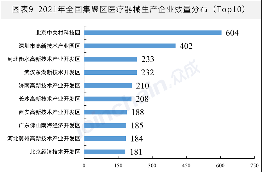 从集聚区排名看,北京中关村科技园医疗器械生产企业604家,位居全国第一;深圳市高新技术产业园区和河北衡水高新技术产业开发区以402家与233家排名第二与第三;其次为武汉东湖新技术开发区(232家)、济南高新技术产业开发区(210家)、长沙高新技术产业开发区(208家)、西安高新技术产业开发区(188家)、广东佛山南海经济开发区(185家)、河北冀州高新技术产业开发区(184家)、北京经济技术开发区(181家)。