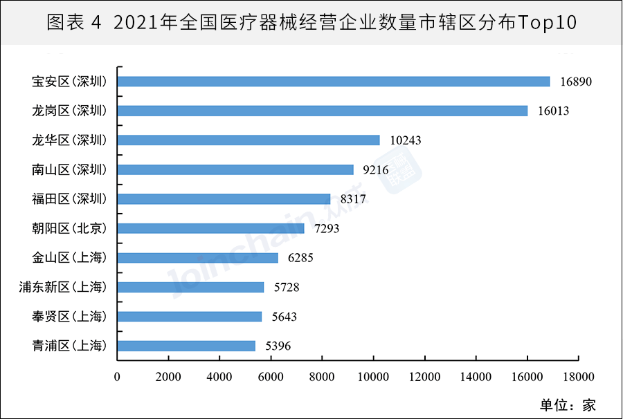从全国各市辖区的医疗器械经营企业数量看,前五均为深圳辖区,深圳宝安区拥有医械经营企业居全国市辖区第一,为16890家,其次是深圳龙岗区16013家和龙华区10243家。全国排名前十的市辖区还有深圳南山区和福田区,北京朝阳区,以及上海金山区、浦东新区、奉贤区和青浦区。
