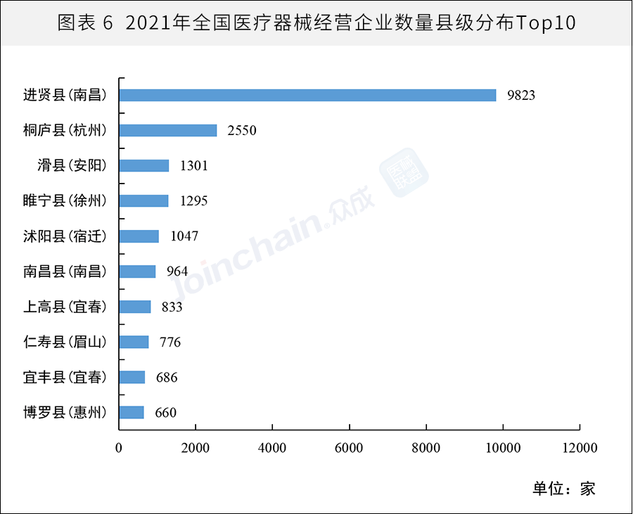 从全国县级的医疗器械经营企业数量看,排名第一的是南昌进贤县,共计9823家,杭州桐庐县以2550家排第二位,安阳滑县以1301家排第三位。