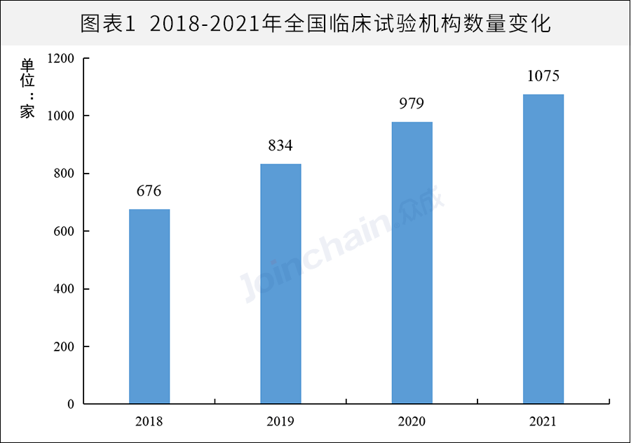 据众成数科(原众成医械)统计,2018-2021年全国临床试验机构持续增长,平均每年增加134家,2021年共有1075家临床试验机构,较去年同期(979家)增长9.8%。
