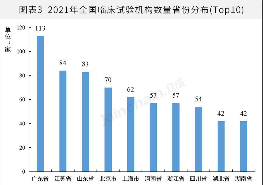 从各省临床试验机构数量上看,广东省依然数量最多,以113家居首位,排名二、三的是江苏省和山东省,分别为84家和83家。总体排名较2020年变化不大,值得关注的是湖北省在2021年进入前十,其数量为42家。