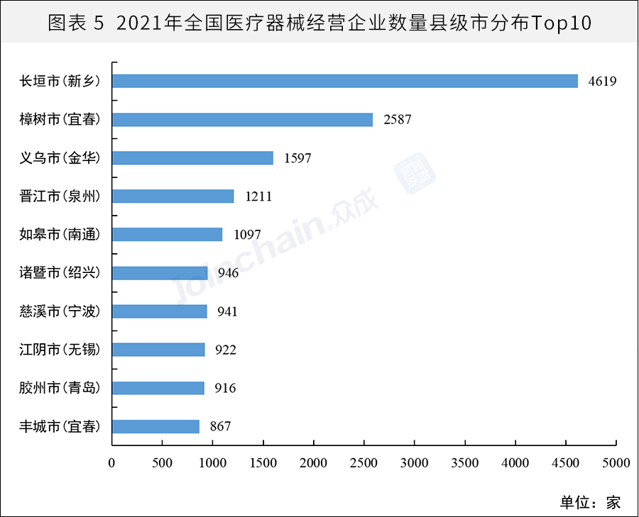 从全国各县级市的医疗器械经营企业数量看,新乡长垣市以4619家高居首位,宜春樟树市以2587家排第二位,金华义乌市以1597家排第三。