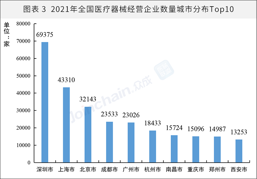 从全国各市的医疗器械经营企业数量看,深圳市以69375家领跑全国,上海市和北京市以43310家和32143家排第二、三位。排名前十的城市还有成都市、广州市、杭州市、南昌市、重庆市、郑州市、西安市。