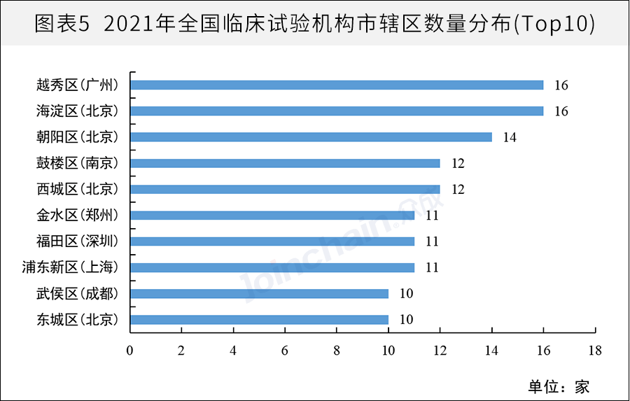 从市辖区临床试验机构数量上看,广州市越秀区和北京市海淀区名列前茅,均为16家;北京市朝阳区紧随其后,数量是14家;之后南京市鼓楼区和北京市西城区同为12家,其他的还有郑州市金水区(11家)、深圳市福田区(11家)、上海市浦东新区(11 家)、成都市武侯区(10家)、北京市东城区(10家)。