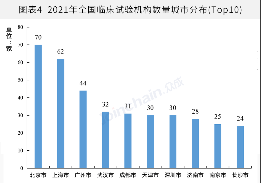 从各城市临床试验机构数量上看,整体城市和排名较去年依然变化较小,北京市仍以70家排第一位,其次上海市62家排第二位,广州市44家排第三位。其他的还有武汉市(32家)、成都市(31家)、天津市(30家)、深圳市(30家)、济南市(28家)、南京市(25家)、长沙市(24家)。