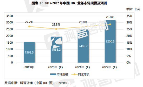 近年来,随着全面上云、数字化转型的推进,作为互联网基础设施的数据中心行业市场发展潜力巨大。《2019-2020年中国IDC产业发展研究报告》显示,2019年,中国IDC业务市场规模达到1562.5亿元,同比增长27.2%,预计2022年中国IDC业务市场规模将超过3200.5亿元。