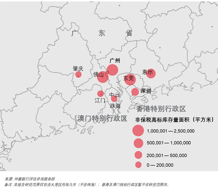 仲量联行评估咨询服务部统计数据显示,粤港澳大湾区内地九市的非保税高标库存量主要集中在广州、佛山及东莞。截至2021年第一季度,广州、佛山、东莞三地非保税高标库存量均超过200万平方米,三市存量之和超过大湾区内地九市总和的3/4;而深圳由于土地资源稀缺,外溢需求推动临近城市东莞及惠州的存量,深圳市范围内的存量不到上述两城总和的1/6。