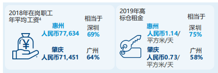 然而,由于深圳和广州仓储市场的高租金以及有限供应,一直以来开发商和租户都在周边城市寻求备选。过去十年间,佛山和东莞是投资者的首要选择,佛山的市场存量增长了4.8倍而租金在2010年至2019年间亦增长了38%。而随着开发商和租户的涌入,佛山和东莞的租赁费用亦水涨船高,从而令到这些溢出的需求再次转移到惠州和肇庆。这两个城市的具有吸引力的租金以及劳动力,将使他们成为下一个物流的热点区域。