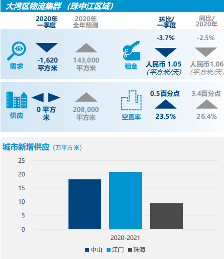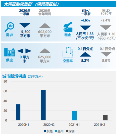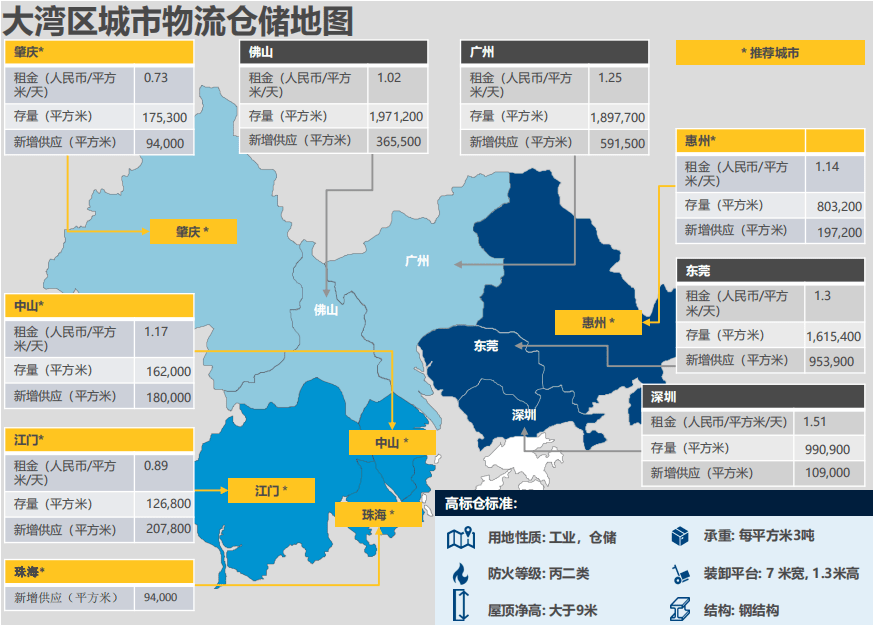 而在大湾区一体化发展的大背景下,东莞、佛山、惠州及中山等临近核心城市的制造业重镇的物流地产市场将迎来更高幅度的本地及外溢需求增长。
