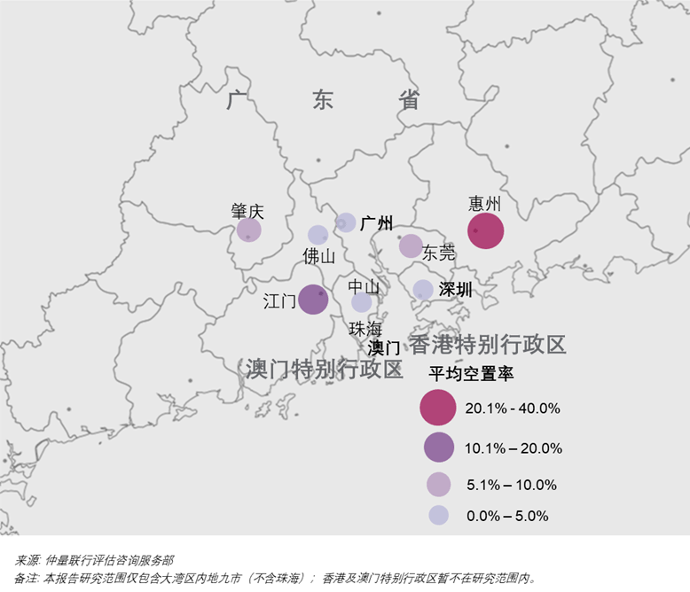 大湾区内地各市中多数城市市场租赁需求强劲,出租表现较好,3/4的城市当季空置率低于10%,其中深圳、中山、佛山及广州四座城市空置率低于4%。另一方面,部分城市如惠州、江门的出租情况则低于大湾区内地主要物流市场平均水平。其原因在于,在深圳需求外溢影响下,惠州近年迎来多个新完工项目入市,短期内为当地高标库去化带来一定压力;而江门地理位置离核心城市较远,且自身经济体量有限,高标库市场需求量低于供应量。