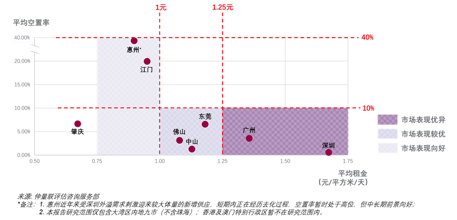 综合来看,大湾区内地各市的物流地产市场呈现多足鼎立的结构。作为大湾区内地九市的核心城市,深圳和广州无疑是大湾区内地各市中的第一梯队,平均租金高于1.3元/平方米/天且空置率在4%以内。此外,毗邻核心城市的制造业重镇,如佛山、东莞、中山等的物流地产市场也表现亮眼,租金中位数均高于1元/平方米/天且空置率均低于7%。