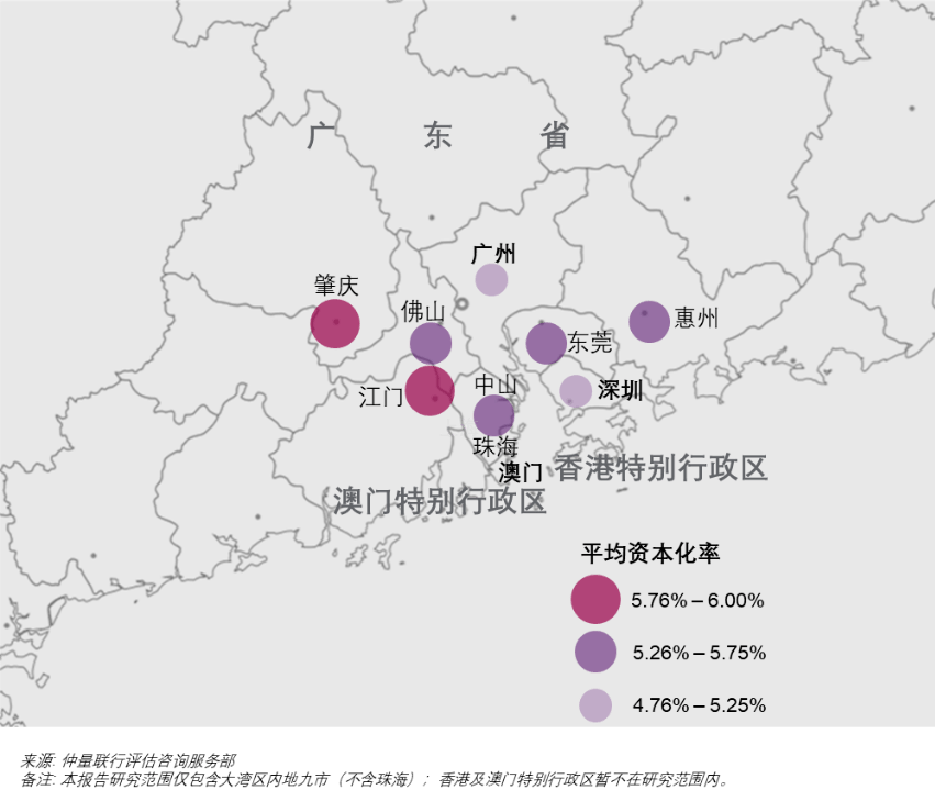 据仲量联行评估咨询服务部统计数据显示,大湾区内地各市主要物流市场中,广州、深圳两座核心城市的高标仓市场平均资本化率为5%左右,在内地处于较低水平,意味着两座城市的高标仓备受投资者青睐。同时,佛山、东莞、中山、惠州等临近核心城市的制造业重镇受自身制造业需求及核心城市外溢需求双重驱动下,其资本化率仅高出一线个百分点以内。而受区位及潜在供应过剩等因素影响,投资者在布局江门、肇庆等地时往往要求6%的资本化率。
