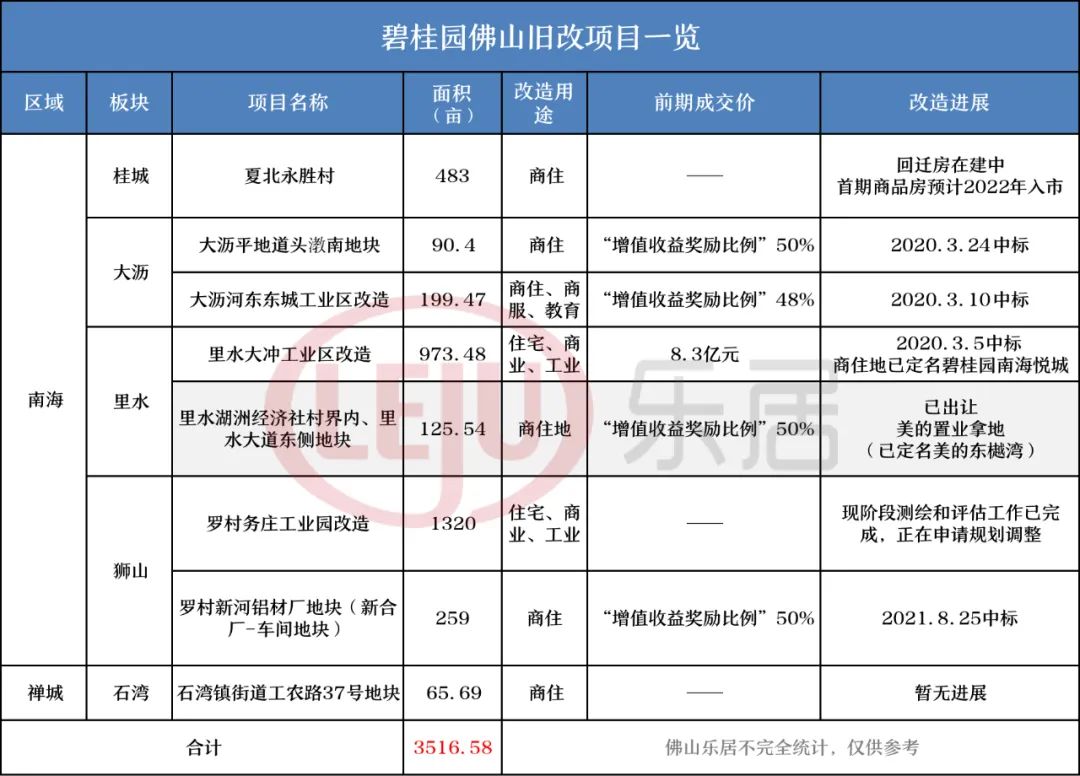 值得一提的是,该改造项目属于全面改造类型,拟采取村企合作改造模式实施改造,项目已于2021年8月25日选定碧桂园旗下的佛山市南海区碧扬房地产开发有限公司作为项目土地前期整理合作方,约定项目土地前期整理成本约为21558万元。