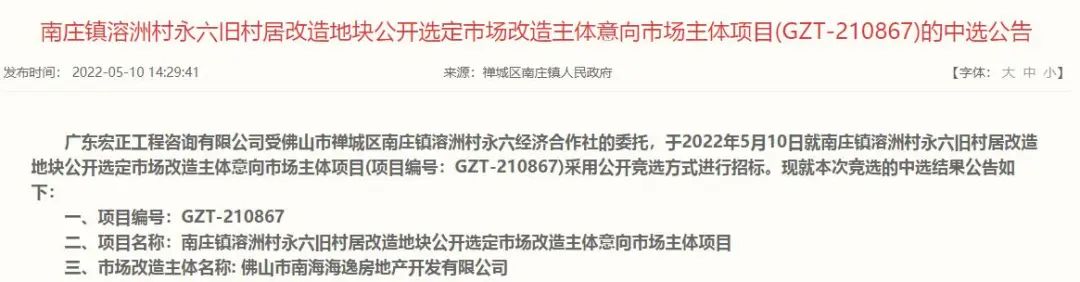 5月10日,乐居编辑从禅城区政府网站获悉,佛山市南海海逸房地产开发有限公司正式中选南庄镇溶洲村永六旧村居改造地块的意向市场主体。值得注意的是,该项目的前期也同为海逸负责。