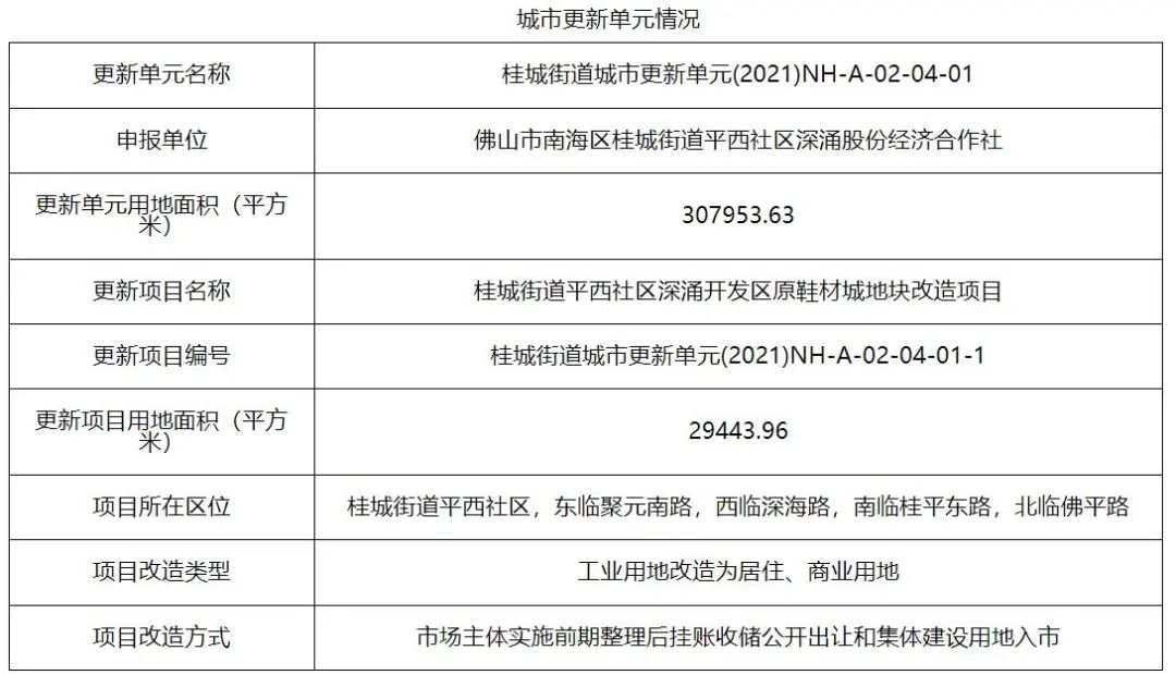 5月13日,南海区政府网站发布了《关于批准桂城街道平西社区深涌开发区原鞋材城地块改造项目城市更新单元计划的公告》。