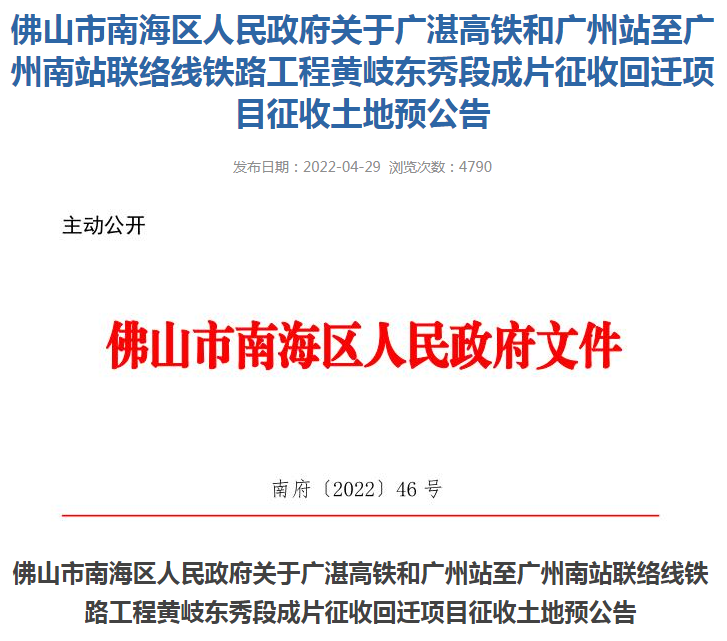 日前,乐居获悉,南海区政府为顺利实施广湛高铁和广州站至广州南站联络线铁路工程黄岐东秀段成片征收回迁项目的建设,启动了黄岐东秀段成片征收回迁项目的征收土地。