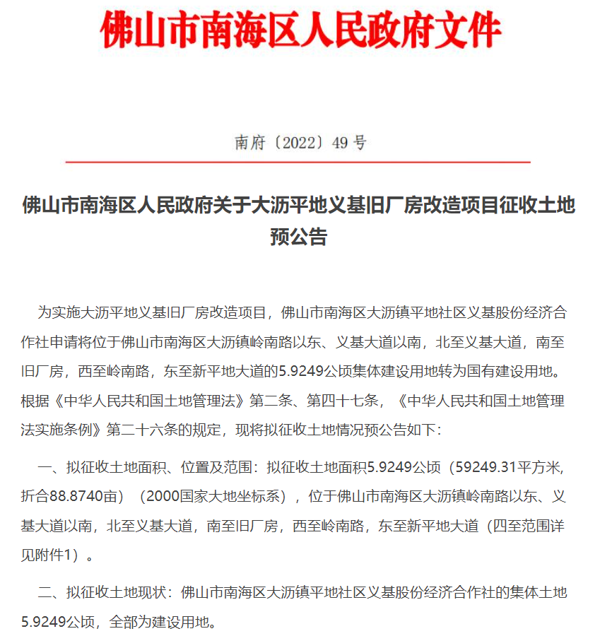 近日,南海政府发布了《关于大沥平地义基旧厂房改造项目征收土地预公告》,公告期至2022年6月7日。