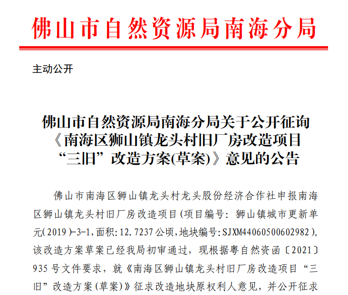 5月9日,南海区政府发布了关于公开征询《南海区狮山镇龙头村旧厂房改造项目“三旧”改造方案(草案)》意见的公告,公示期5月7日至5月22日。