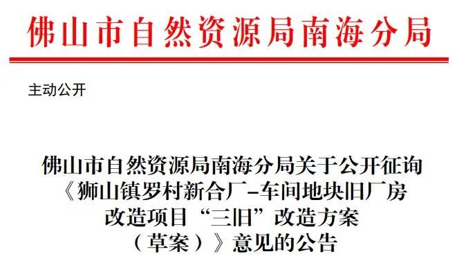 5月10日,南海区政府网站发布了关于公开征询《狮山镇罗村新合厂-车间地块旧厂房改造项目“三旧”改造方案(草案)》意见的公告。