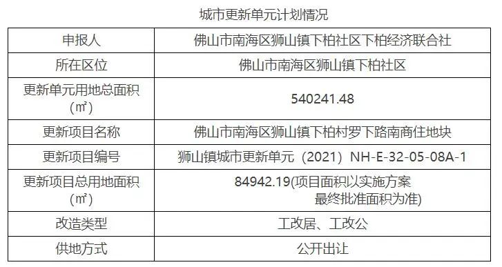 根据公示,狮山镇下柏村罗下路南商住地块总用地面积84942.19㎡,改造类型为工改居、工改公,供地方式为公开出让。