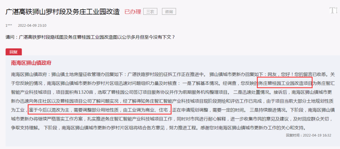 日前,有网友在人民网领导留言板进行了提问,广湛高铁罗村段路线图及务庄碧桂园工业园改造图已公示多月但至今没有下文?